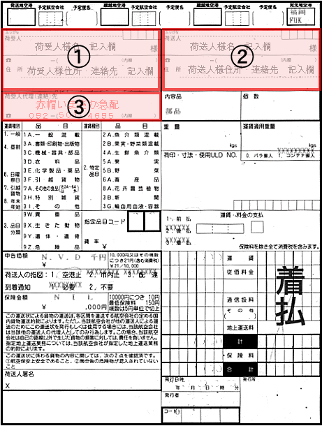 取扱ヤード内の航空会社(ANA/JAL)貨物カウンターへお荷物を持ち込まれますと、下記の様な運送状を渡されますので下記の赤枠内へご記入をお願い致します。